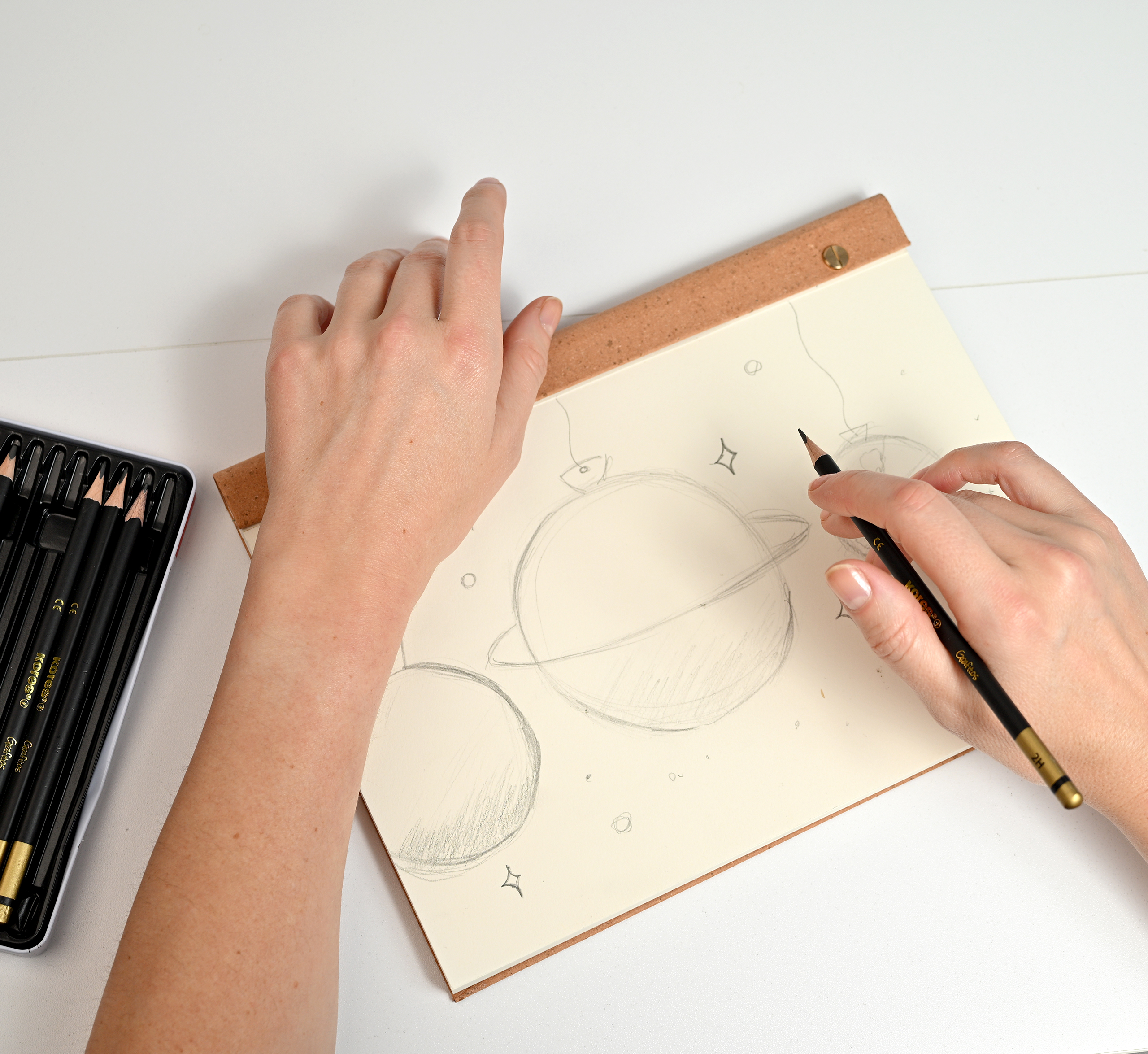 Скицник: Тяло 100 гр кремава хартия с лека текстура, идеална за рисуване с молив, въглен, химикал, ролер, пастели, дори акварел; без печат