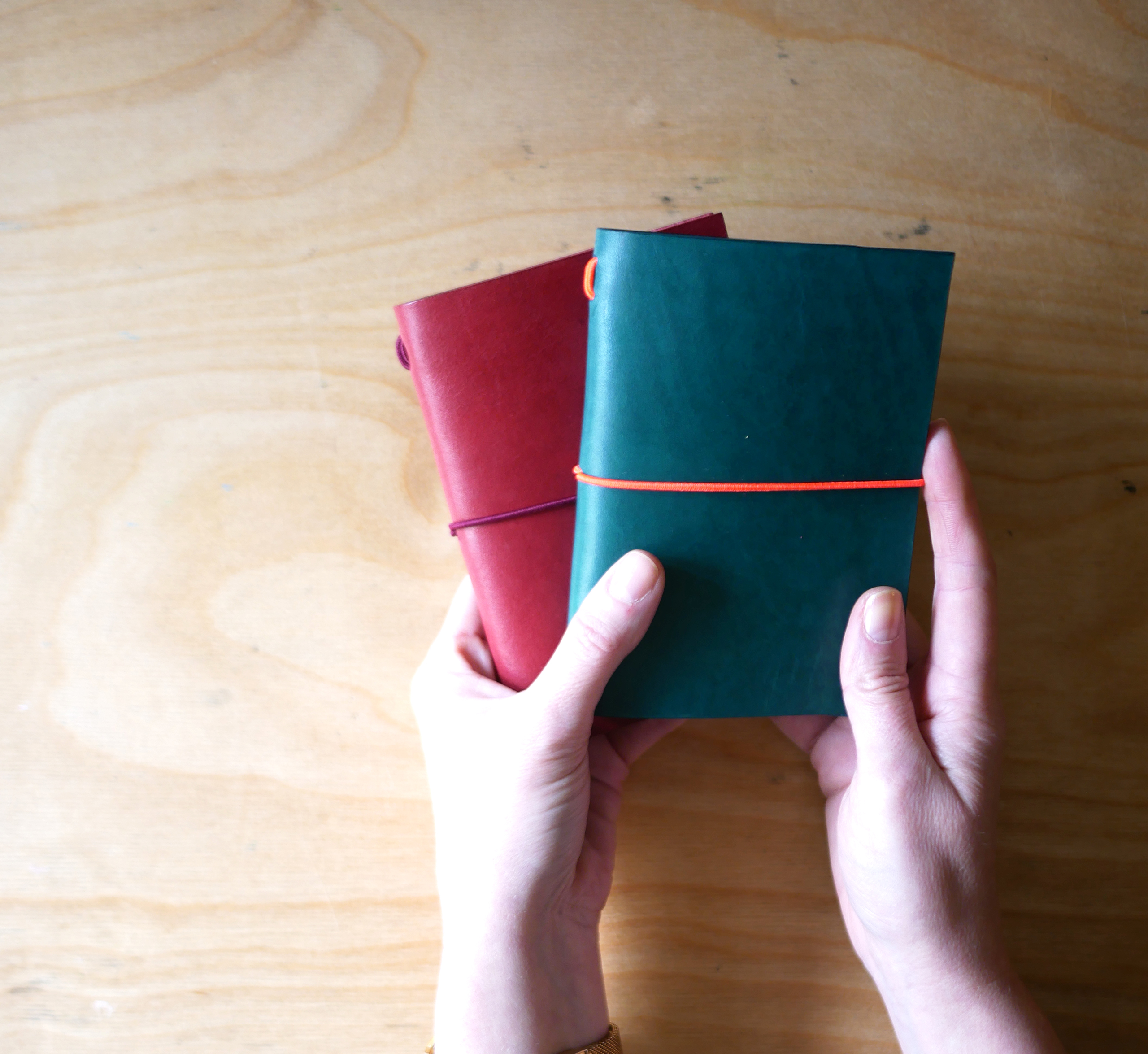 • Подвързия от естествена растително дъбена кожа формат А6 (избери цвят – тюркоаз или бордо) – 1 бр.