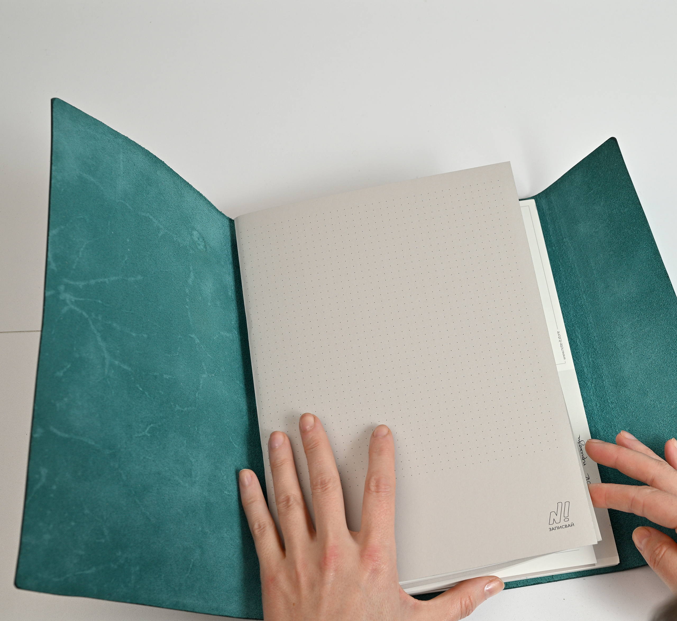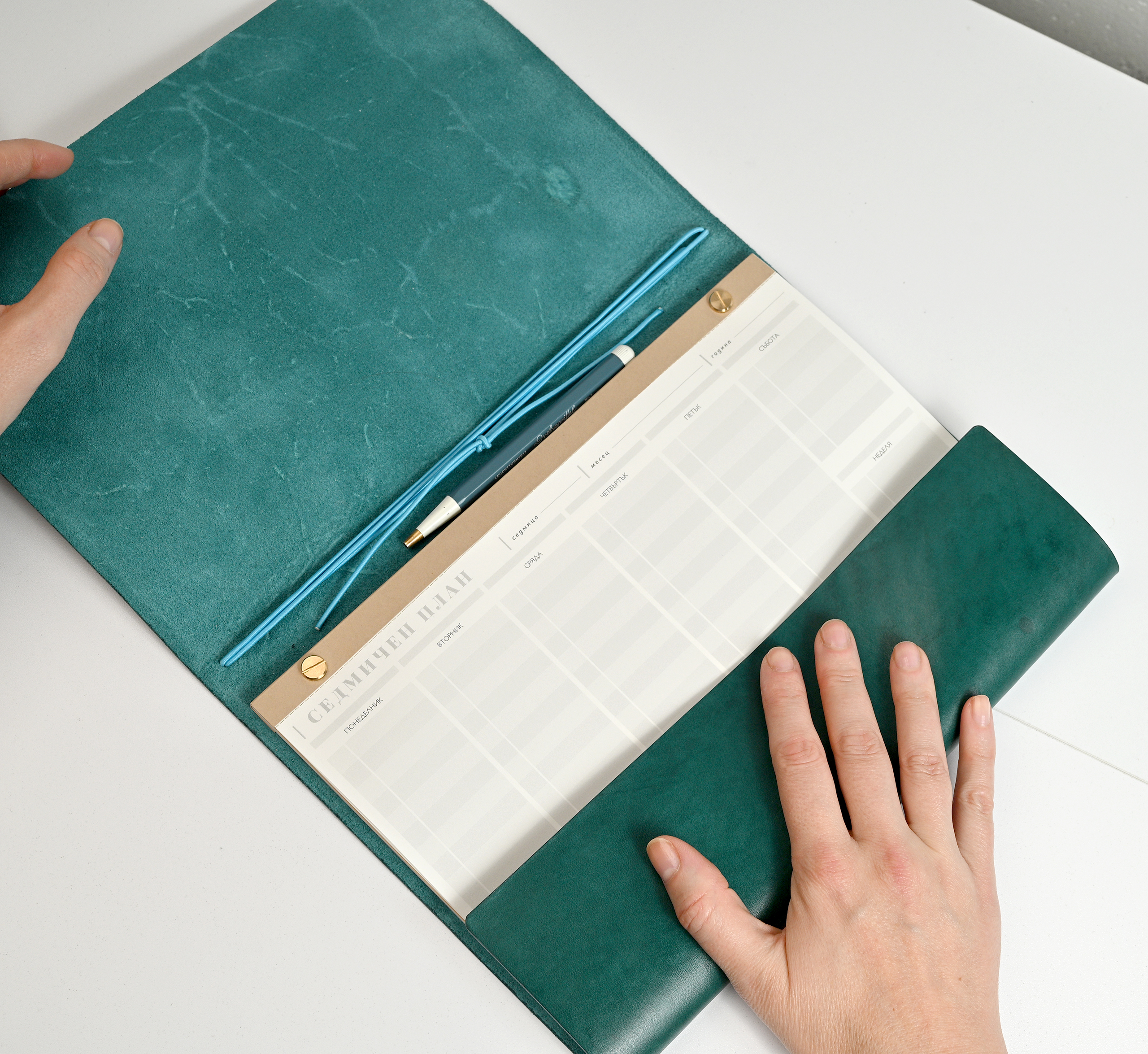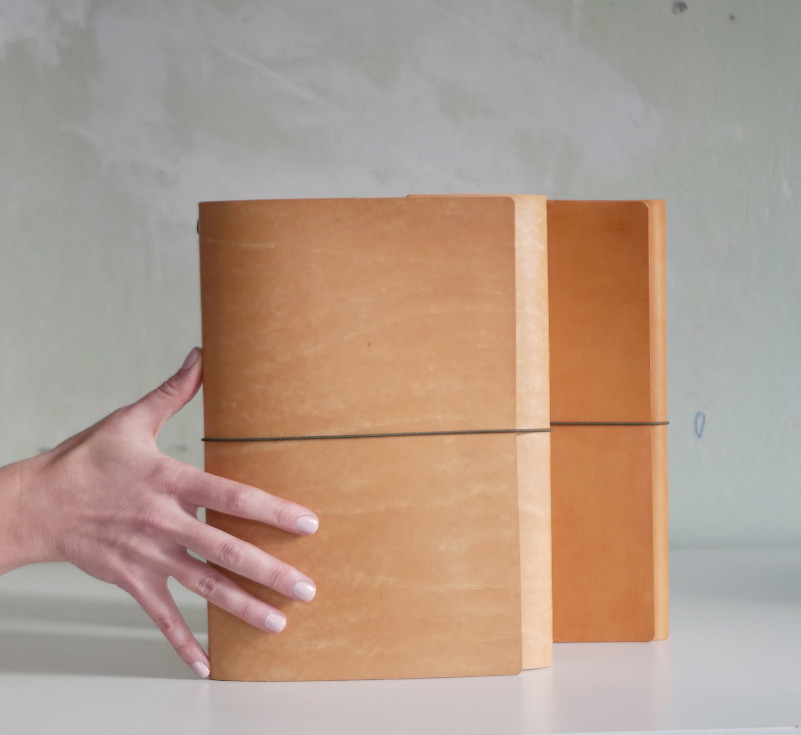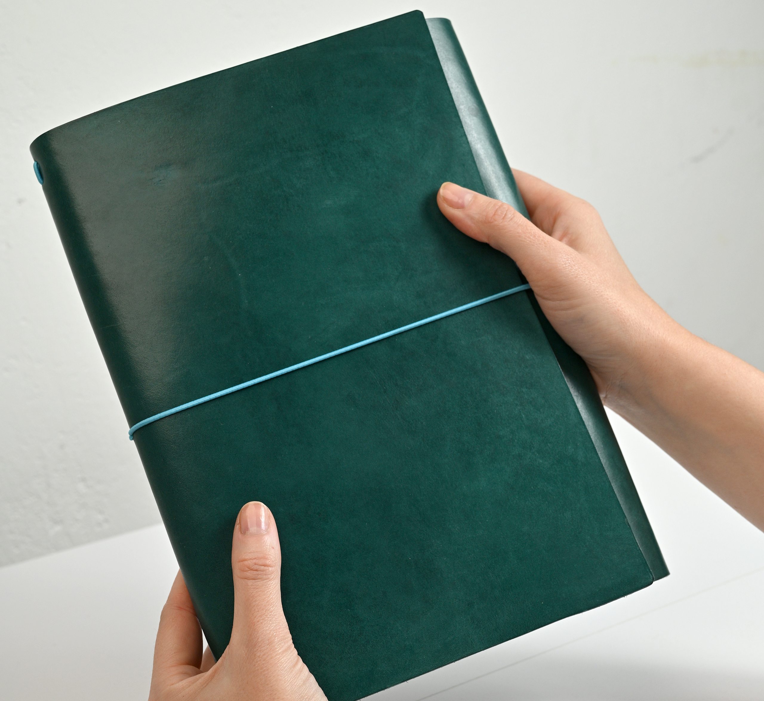 Повече пространството за твоите мисли и идеи в двойно по-голям формат в новото кожено портфолио. Подвързията е ръчно изработена от естествена, растително дъбена кожа, защитена е с масло, което оставя усещане за мек и елегантен допир. Идва в палитра от 6 цвята с един пълнител. Можеш да надграждаш лесно, като добавяш допълнителни тетрадки на принципа на ластичните класьори, както в нашия стартов пакет, и да подмениш ноутпада според нуждите си като използваш вградените месингови нитове.